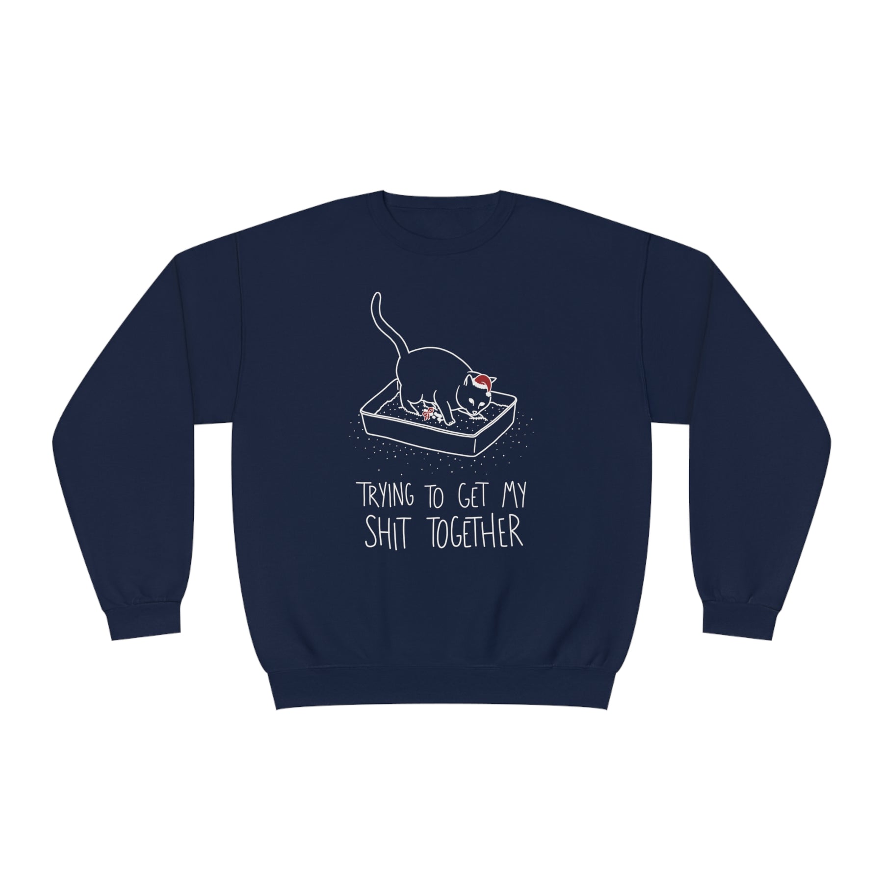 We've put a holiday spin on our classic Trying to Get My Shit Together design! Especially as the holidays fa-la-la-fly our way...there are some days where it seems like you just can’t seem to get your shit together! With gifts to find, feasts to cook, and cookies to bake ... it's hard to keep it all together! Oh, well. Life’s hard and then you cry. Right? Nah! Take a lesson from your cat: Cover up the bad shit and dust off those paws.